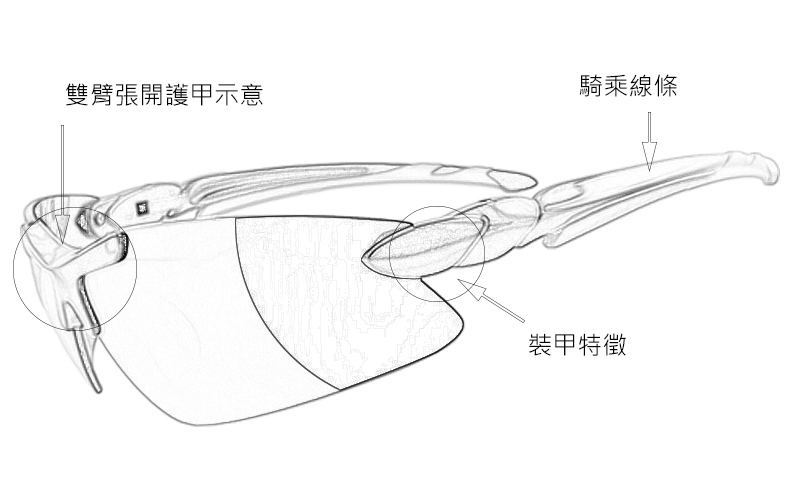 採用太空防爆高階雙曲度鏡片,就像雙眼從頭盔內的細縫看出,專注在獵物的動向,並有效阻抗外力帶來的傷害。
